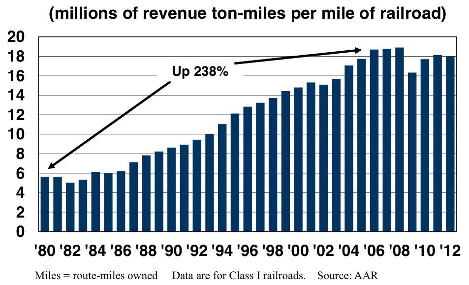 As this downsizing slowed, the rail industry was unexpectedly hit by traffic growth. U.S. railroad ton-miles have tripled in the period from 1950 to 2009:
